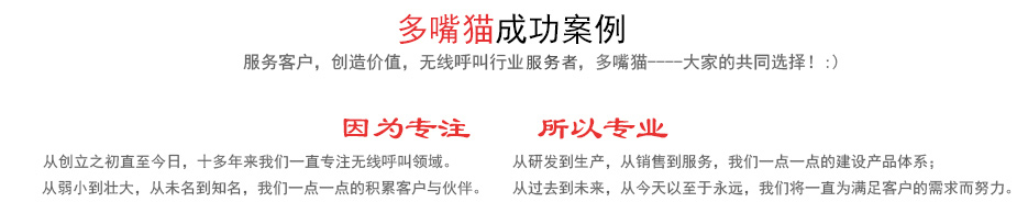 有句名言说的是“世界上没有比人更高的山,没有比脚更长的路”, 而这风尘仆仆一步一个脚印走出的路程,正是见证多嘴猫壮人心魄的发展历程。多嘴猫产品自2002年以来一直笑傲整个无线呼叫领域,为广大客户所亲睐,不单是与多嘴猫产品高新的技术和精美的外观分不开,也与多嘴猫全面入微售后服务也有很大联系。