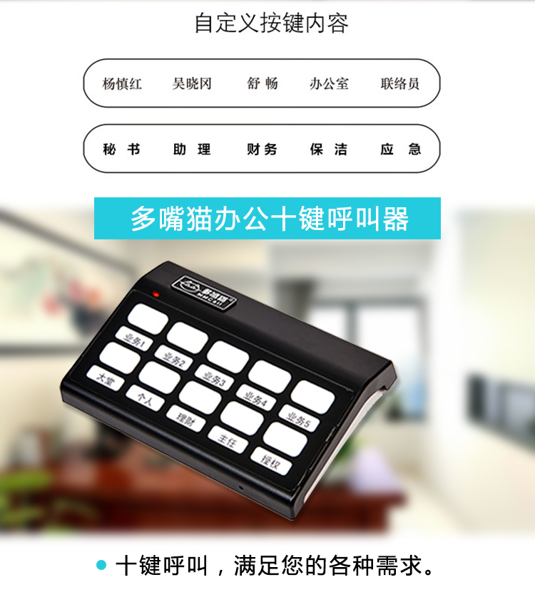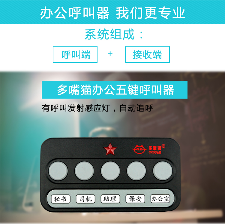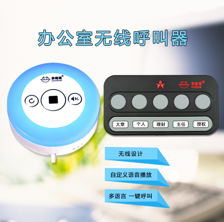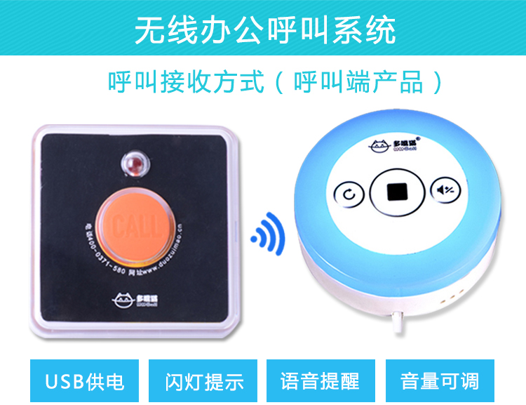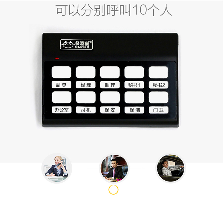 特点:七种颜色感应灯 不同领导呼叫可以显示不同颜色 可以接收多个领导呼叫 外观小巧 USB充电 不占地 可平放 实用又美观 自定义录制语音 中文 英文 西班牙语都可以 语音自定义 想说什么 您说了算 接收模式设置 离开座位期间如有呼叫 接收灯会亮 看到后 按下重播键即可收到呼叫 音量大小可调