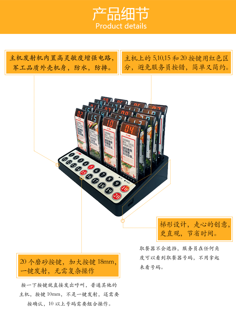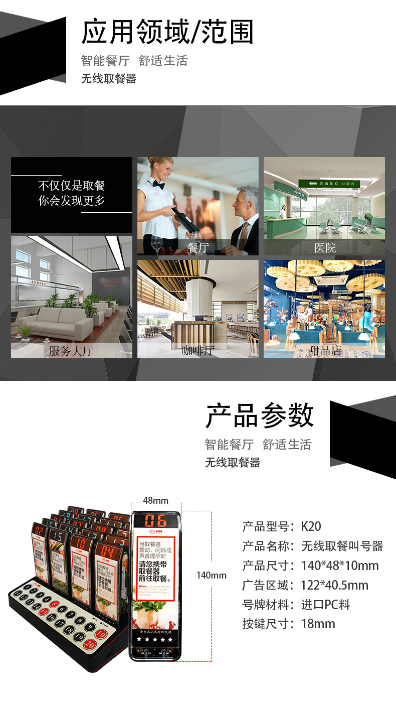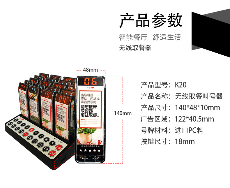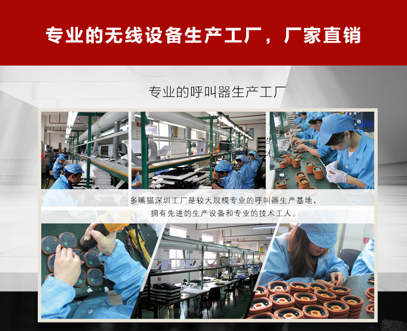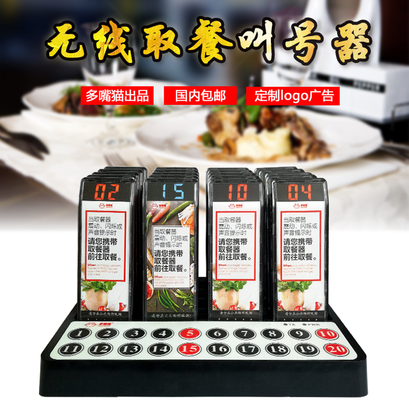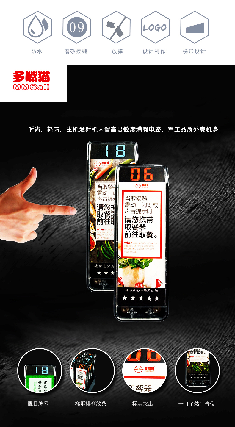 特点:多嘴猫经济型无线取餐呼叫系统,产品信号覆盖距离远,取餐呼叫器设计新颖,适合中小餐饮、娱乐等服务场所。