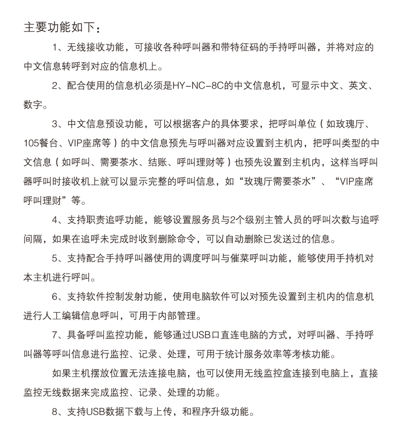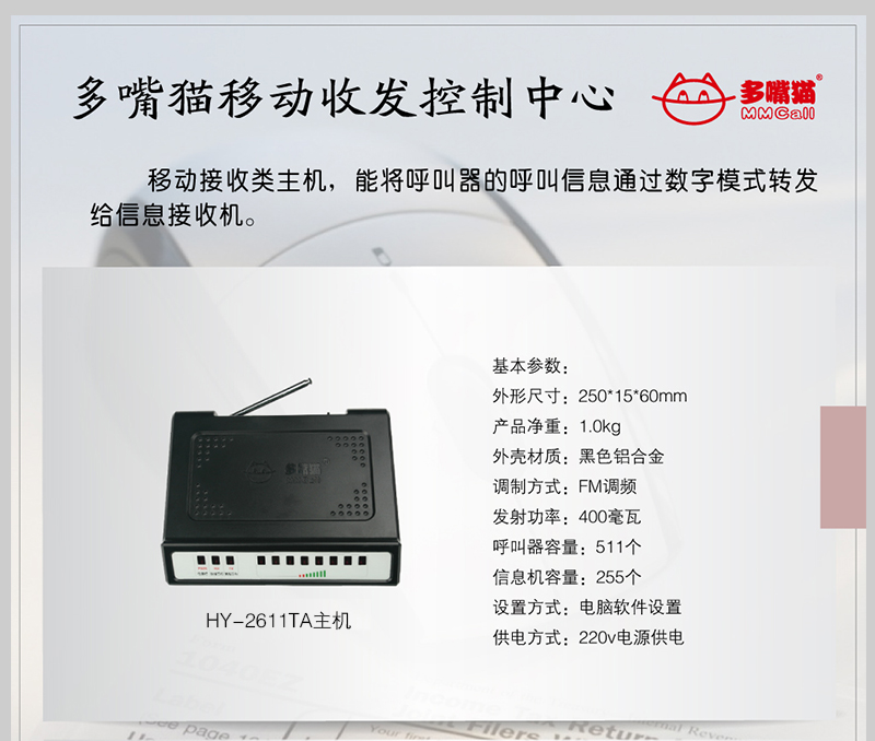高性价比的移动接收类主机,能将呼叫器的呼叫信息通过数字模式转发给信息接收机。可兼容多嘴猫全系列呼叫器。