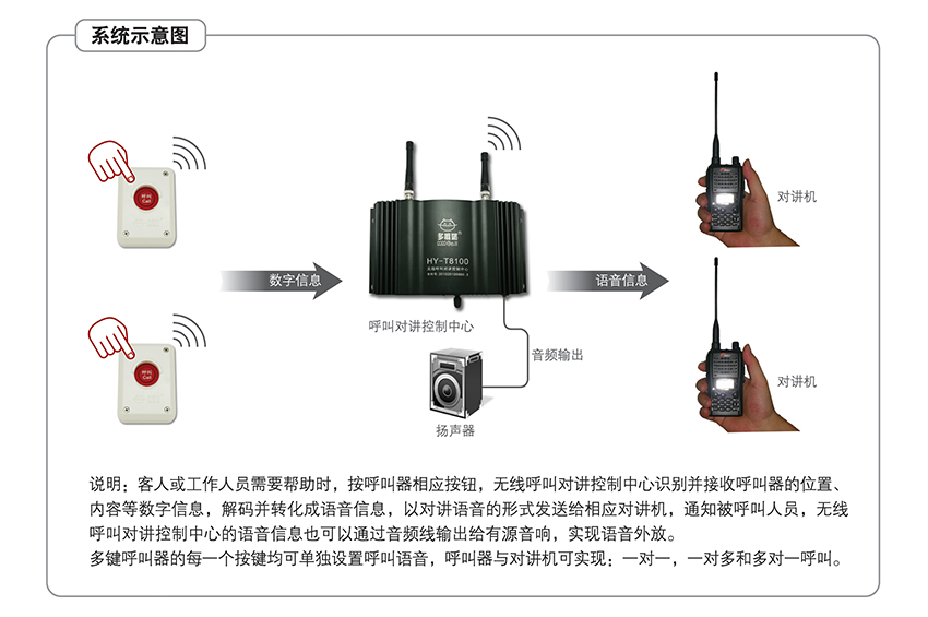 呼叫器与对讲机之间可实现一对一、一对多和多对一呼叫,满足不同管理流程的需要。