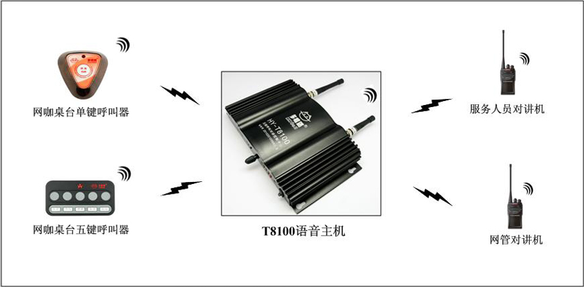 在每个座位上安装多嘴猫无线呼叫器,客人在休闲娱乐过程中,可以通过按多嘴猫呼叫服务员或者网管。呼叫信号通过语音控制中心发送至网管或者服务员随身佩戴的对讲机上,服务员通过语音播报来为客人服务。很多网咖安装了五键呼叫器,五个按键可以自定义呼叫服务员、网管或者餐品服务等。
