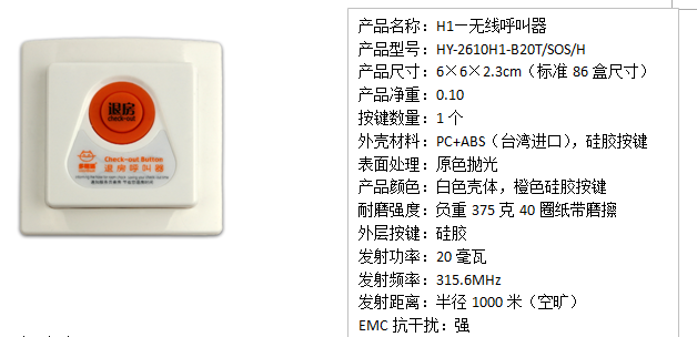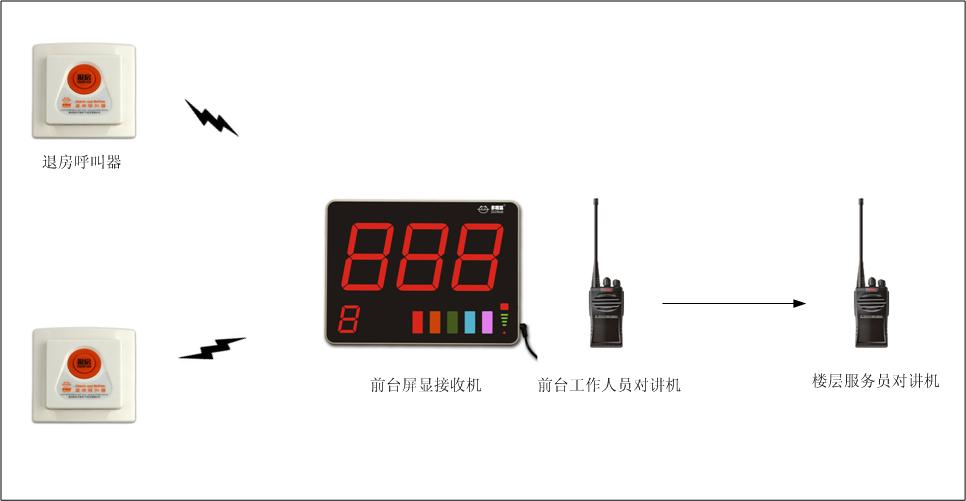 退房呼叫器采用调频无线技术(无需布线,不破坏装修)安装在房卡插座旁边,在客人离开时,按一下退房呼叫器的按钮,楼层服务员随身携带的数字信息机就可以收到信息,立即开始查房,在客人到达总台之前,服务员就可以通过房间电话向总台确认查房完毕,为酒店的查房操作节省大量时间,由原来的十几分钟降至两三分钟,极大地提高了星级酒店的服务质量和形象。